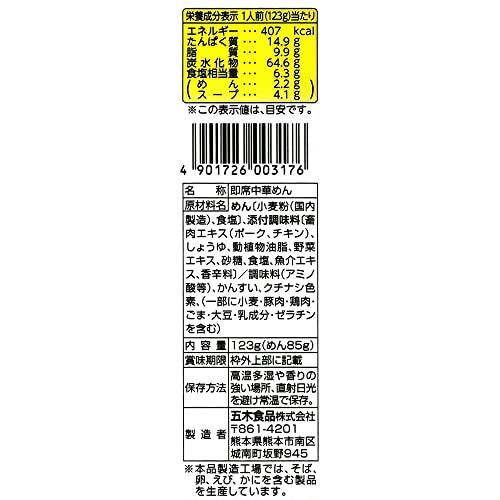 原材料:めん(小麦粉、食塩)、畜肉エキス(ポーク、チキン)、醤油、動植物油脂、野菜エキス、砂糖、食塩、魚介エキス、香辛料/調味料(アミノ酸等)、かんすい、クチナシ色素、(一部に小麦・豚肉・鶏肉・ごま・大豆・乳成分・ゼラチンを含む)