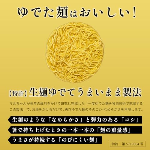 【ゆでた麺はおいしい】マルちゃんが長年の歳月をかけて研究し完成した「一度ゆでた麺を独自技術で乾燥するこの製法」で、お湯をかけるだけで、再びゆでた麺のしにコシ・なめらかさを再現します。