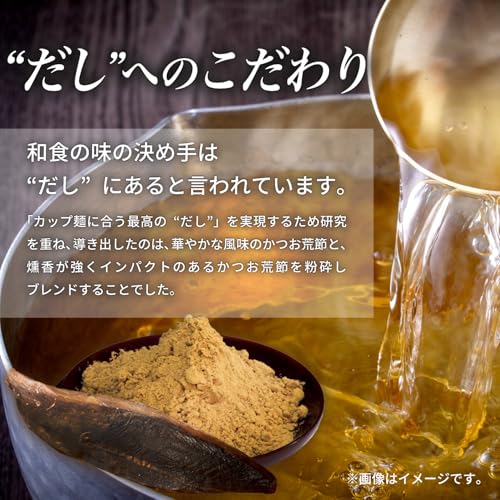 【こだわりのだし】和食の決め手は“だし"にあると言われています。「カップ麺に合う“だし"」を実現するためかつお節の段階から研究を重ね、その粒度にまでこだわった、かつお荒節粉末を使用しています。