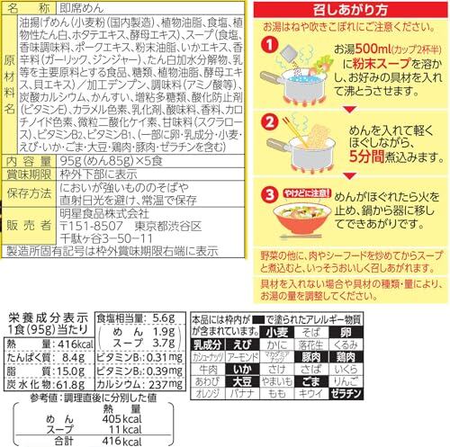 油揚げめん(小麦粉(国内製造)、植物油脂、食塩、植物性たん白、酵母エキス)、スープ(食塩、香味調味料、ポークエキス、粉末油脂、いかエキス、香辛料(ガーリック、ジンジャー)、たん白加水分解物、乳等を主要原料とする食品、糖類、植物油脂、酵母エキス、貝エキス)/加工デンプン、調味料(アミノ酸等)、炭酸カルシウム、かんすい、増粘多糖類、酸化防止剤(ビタミンE)、カラメル色素、乳化剤、酸味料、香料、カロチノイド色素、微粒二酸化ケイ素、甘味料(スクラロース)、ビタミンB2、ビタミンB1、(一部に卵・乳成分・小麦・えび・いか・ごま・大豆・鶏肉・豚肉・ゼラチンを含む)