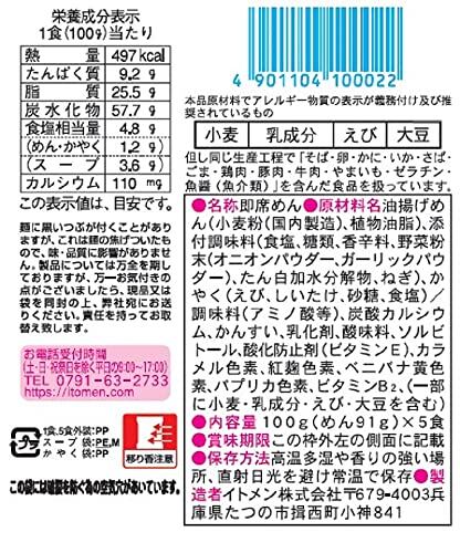 油揚げめん(小麦粉(国内製造)、植物油脂)、添付調味料(食塩、糖類、香辛料、野菜粉末(オニオンパウダー、ガーリックパウダー)、たん白加水分解物、ねぎ)、かやく(えび、しいたけ、砂糖、食塩)/調味料(アミノ酸等)、炭酸カルシウム、かんすい、乳化剤、酸味料、ソルビトール、酸化防止剤(ビタミンE)、カラメル色素、紅麹色素、ベニバナ黄色素、パプリカ色素、ビタミンB2、(一部に小麦・乳成分・えび・大豆を含む)