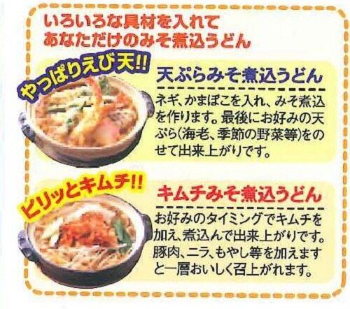 原材料:油揚げめん(小麦粉、ラード、植物油脂、食塩、みそ)、粉末みそ、食塩、砂糖、粉あめ、七味唐辛子、脱脂粉乳、粉末かつお節、酵母エキス、調味料(アミノ酸等)、炭酸カルシウム、酸化防止剤(V.E、V.C)、(原材料の一部に豚を含む)