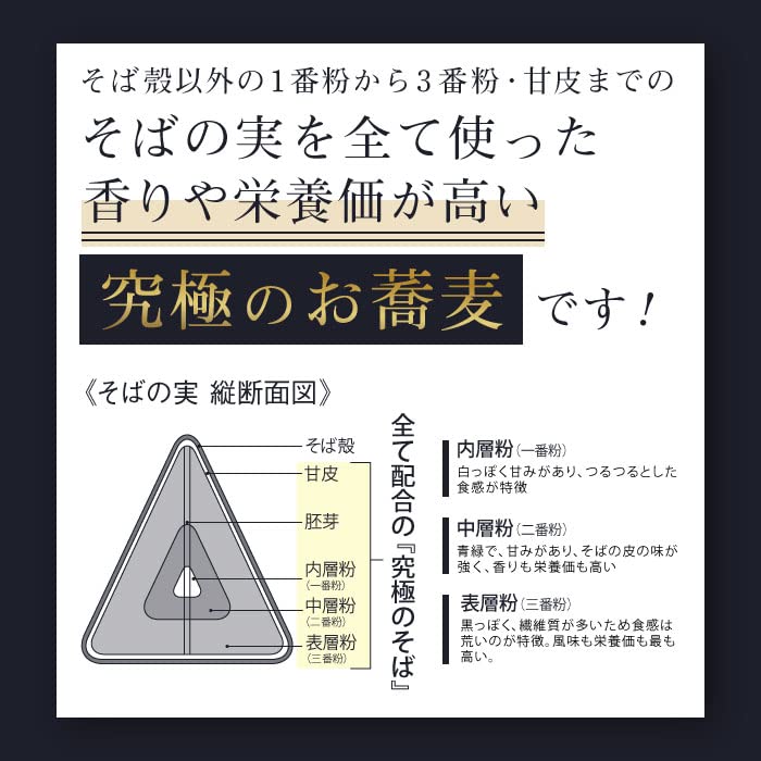 そばの実の中心の一番粉から三番粉・甘皮までを使った究極のお蕎麦です。そばの実を全て使っているため、香りや栄養価が高いのが特徴です。