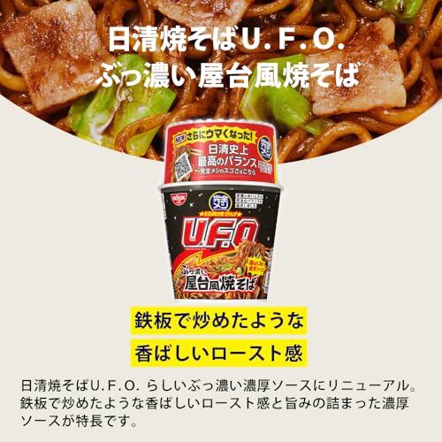日清焼そばU.F.O.らしいぶっ濃い濃厚ソースにリニューアル。鉄板で炒めたような香ばしいロースト感と旨みの詰まった濃厚ソースが特長です。