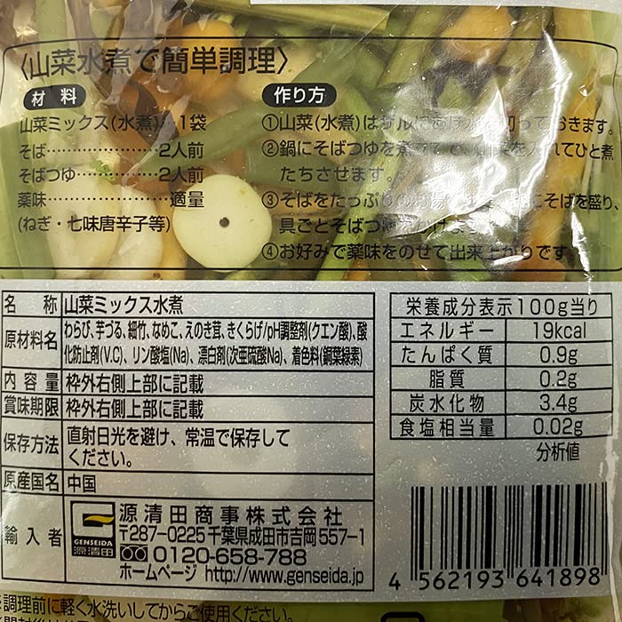 山菜ミックスのお手軽水煮パックです。わらび、芋づる、細竹、なめこ、きくらげ、えのき茸の山菜ミックス。