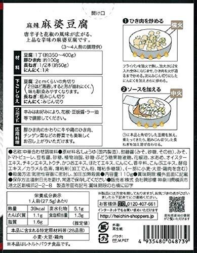 原材料:醤油(国内製造)、甜麺醤(みそ、砂糖、その他)、みそ、トマトピューレ、豆板醤、砂糖、植物油脂、砂糖・ぶどう糖果糖液糖、花椒油、水あめ、オイスターエキス、チキンエキス、トウチ、かつおエキス、ほたてエキス、にんにく、香辛料、こんぶエキス、酵母エキス/カラメル色素、増粘剤(加工でん粉、増粘多糖類)、(一部に小麦・大豆・鶏肉を含む)