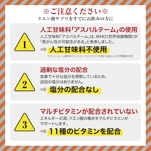 【マルチビタミン】11種類のビタミンを1日必須量配合。主要成分/1日1包(6g)当たり:クエン酸:2,000㎎、葉酸:240μg、ビタミンC:100㎎、ビタミンB6:1.3㎎、ビタミンB12:2.4μg、ビタミンD:5.5μg、ビタミンA:770μg、ビタミンE:6.3㎎、ビタミンB1:1.2㎎、ビタミンB2:1.4mg、ナイアシン(ビタミンB3):13㎎、パントテン酸:4.8㎎