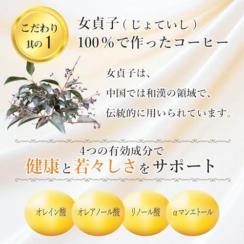 ・女貞子コーヒーは、若々しさと健康のサポート ・国産の女貞子(ネズミモチの果実)を使用。一方で、市場に出ているものの大半は外国産です。 ・女貞子は、中国でも、和漢の領域で健康のために用いられています。 ・女貞子100%のコーヒーで、飲み方は、インスタントみたいに、粉末をお湯やミルクにとかすだけ ・キャラメルのような独特の甘みもあり、牛乳を入れるとカフェラテのような味わい ・1袋に85g入っていて、1日1杯飲むと約1ヶ月分