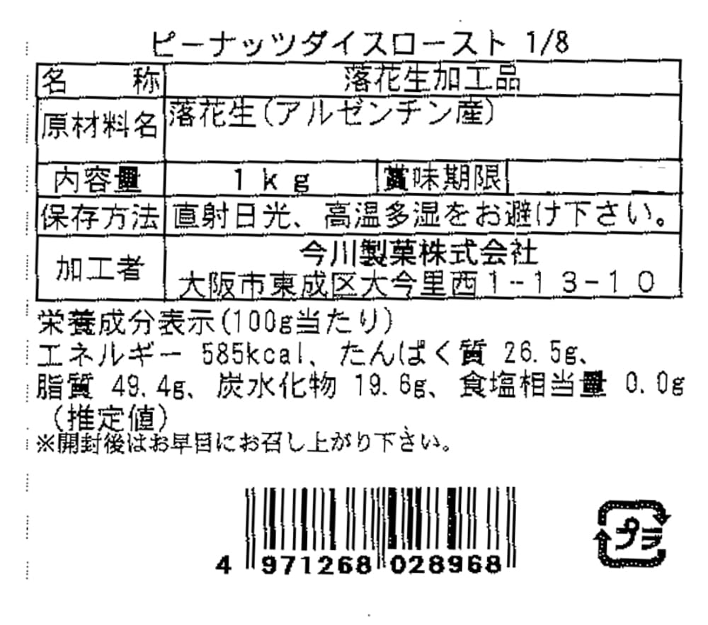 焙煎済み、8割ダイスカットピーナッツ1kg入りです。
