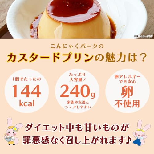 こんにゃくパークで人気のデザート「カスタード風プリン」。こんにゃく粉入りでなめらかな食感が魅力です♪卵不使用なので、卵アレルギーの方やお子様も安心して食べらます。1個240gのたっぷりサイズなので、家族や友達とシェアしてもOK。1個あたり144kcalで、一般的なプリンよりも低カロリーのため、ダイエット中の方にもおすすめです。