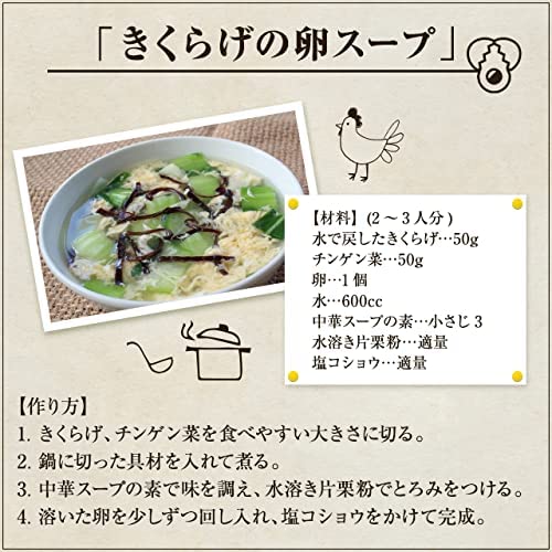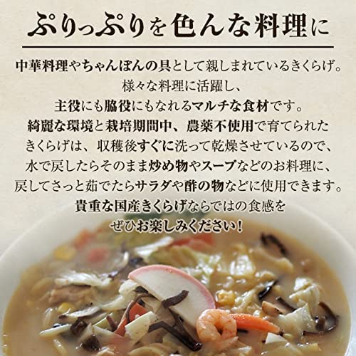 【様々な料理にご活用可能】中華料理やちゃんぽんの具として親しまれているきくらげ。様々な料理に活躍し、主役にも脇役にもなれるマルチな食材です。水で戻したらそのまま炒め物やスープに、戻して茹でたらサラダや酢の物に使用できます。