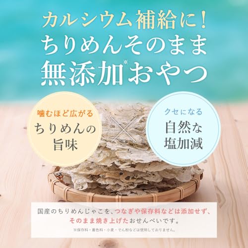 【国産ちりめんそのまま】無添加カルシウムおやつ!歯ざわりサクっ、ふわっ。お口でしっとり新食感。噛むほど広がるちりめんの旨味と自然な塩加減がやみつきに!カルシウム補給に、ちりめんそのまま無添加おやつをどうぞ。国産のちりめんじゃこを、つなぎや保存料などは添加せず、そのまま焼き上げたおせんべいです。