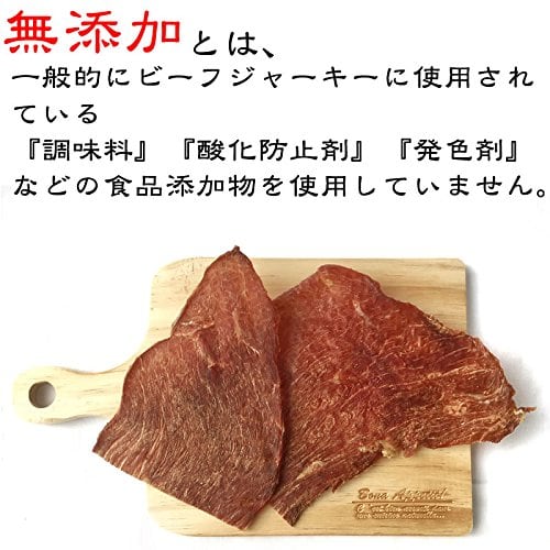 無添加ビーフジャーキー:最も味わい深いと言われるもも肉のみを贅沢に使用してます。噛めばかむほどその旨味があふれ、口の中に広がります。