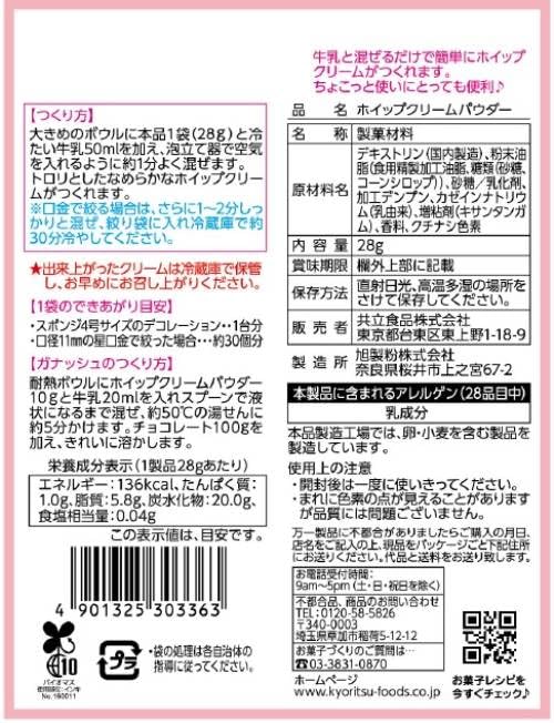 原材料:デキストリン(国内製造)、粉末油脂(食用精製加工油脂、糖類(砂糖、コーンシロップ))、砂糖/乳化剤、加工デンプン、カゼインナトリウム(乳由来)、増粘剤(キサンタンガム)、香料、クチナシ色素