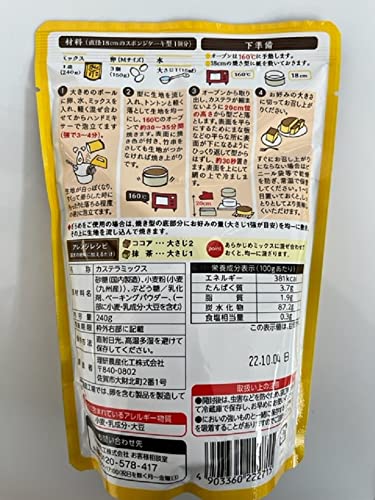 原材料:砂糖(国内製造)、小麦粉(小麦(九州産))、ぶどう糖/乳化剤、ベーキングパウダー、(一部に小麦・乳成分・大豆を含む)