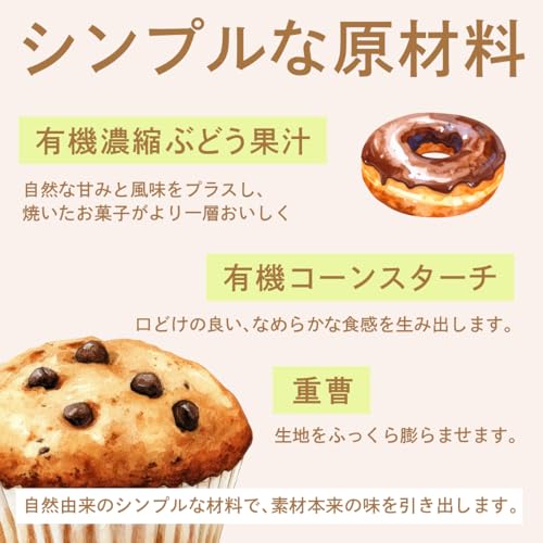 【究極のシンプル&ピュアな原材料】 有機濃縮果汁・有機コーンスターチ・重曹のたった3つのシンプルな有機原材料だけで作られています。余計なものは一切加えていません。素材本来の風味を活かし、ご家族の健康を第一に考えたお菓子作りをサポートします。お子様から大人まで、どなたにも安心してお楽しみいただけるピュアな配合です。