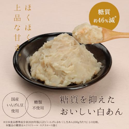 【糖質を抑えたおいしい白あん】国産白いんげん豆を使用し、やさしい上品な甘さに仕上げた白あん。エリスリトールを使用し糖質を抑えつつも、満足感のある美味しさにこだわりました。