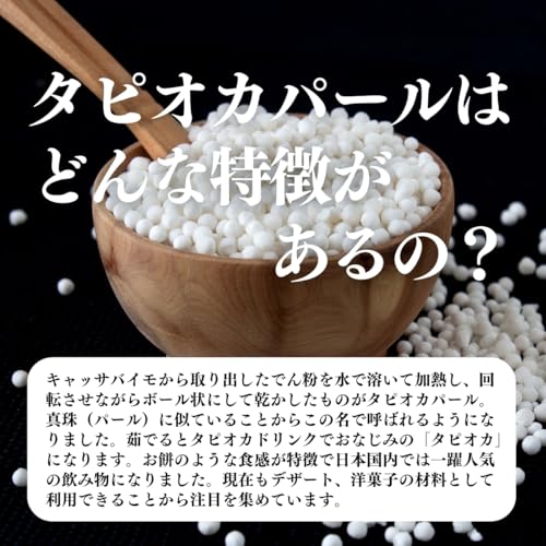 【タピオカパールについて】キャッサバイモ由来のでん粉であるタピオカをボール状に固めたもので別名パールタピオカ。歯ごたえが人気で中華、東南アジア、台湾などの周辺国ではデザートや料理の材料として人気です。日本でもタピオカは人気の食材で製菓、製パン、スイーツなどお菓子材料にも用いられています。
