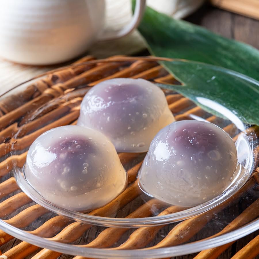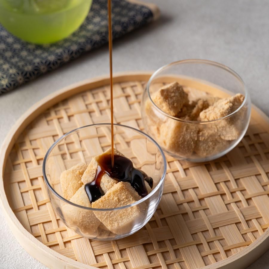 ●作り方 ●材料 特撰わらび粉/100g・水/400cc・上白糖/200g 【1】特撰わらび粉を水で溶解し、上白糖を加えてよく混ぜる。【2】中火にかけよく練りこむ。【3】透明になったら弱火にして、さらに5分間程力を入れて練りこむ。【4】流し箱に流し、冷やしてから適当な大きさに切り分け、きな粉をまぶす。