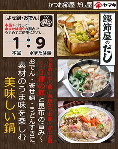 原材料:砂糖、食塩、たん白加水分解売物(大豆を含む)、しょうゆ(小麦を含む)、うるめいわしぶし、そうだかつおぶし、こんぶ/調味料(アミノ酸等)、カラメル色素