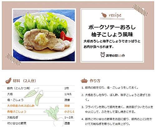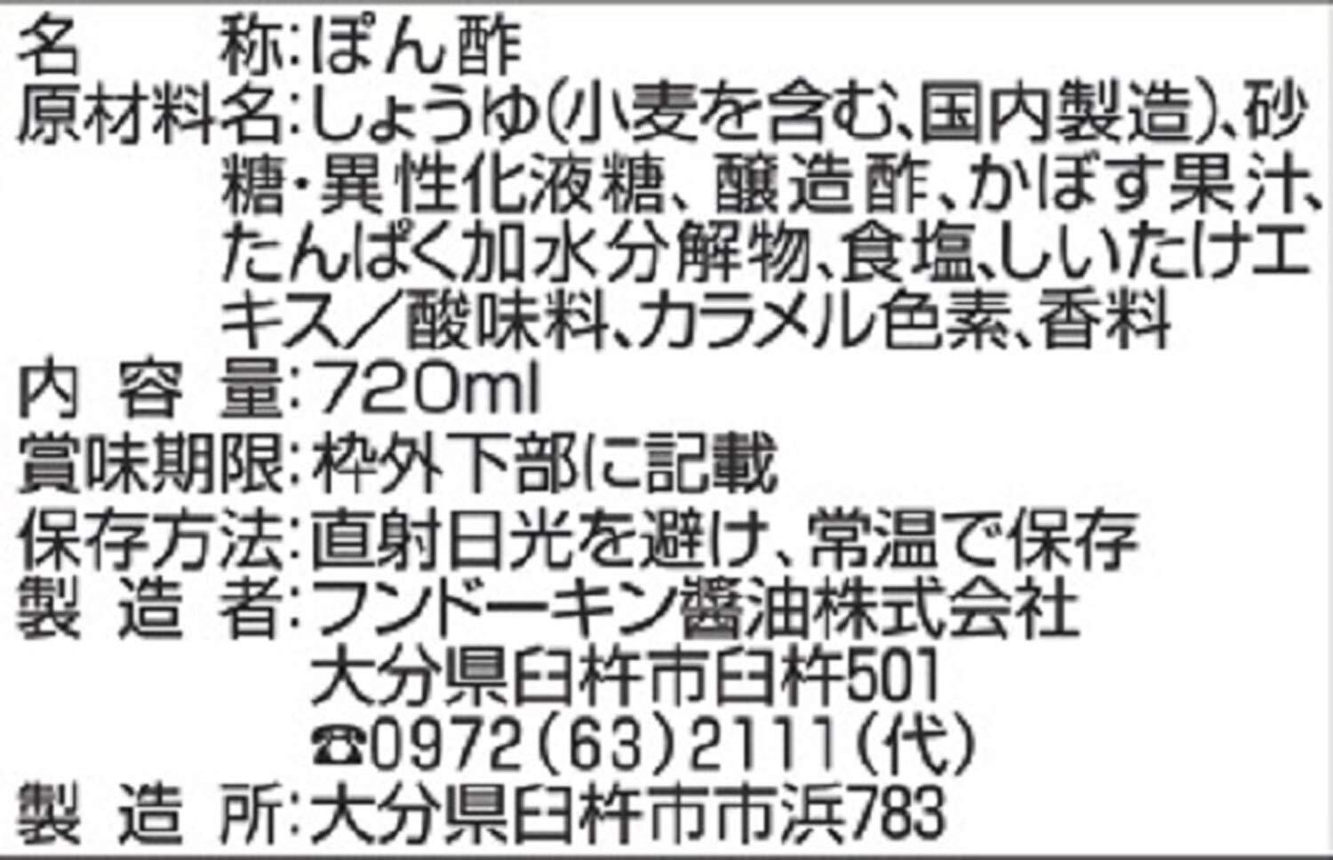 原材料:しょうゆ(小麦を含む、国内製造)、砂糖・異性化液糖、醸造酢、かぼす果汁、たんぱく加水分解物、食塩、しいたけエキス/酸味料、カラメル色素、香料