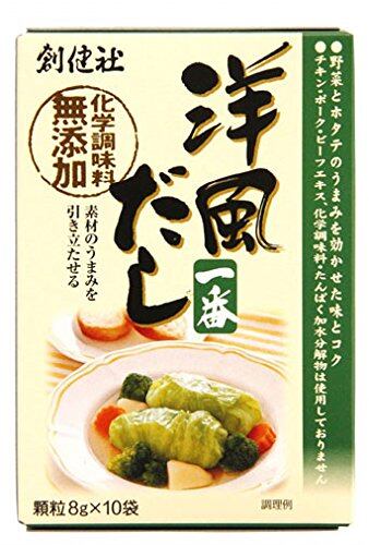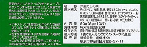 原材料:デキストリン(タイ他海外)、食塩(メキシコ)、乳糖(アメリカ)、野菜エキス(キャベツ、オニオン、キャロット)、粉末醤油、酵母エキス、オニオンパウダー、粉末発酵調味料、ホタテエキス(北海道)、香辛料(ホワイトペッパー、セロリー末)、(原材料の一部に乳、小麦、大豆を含む)