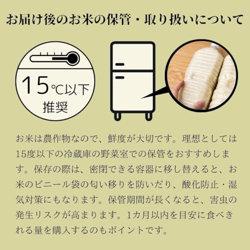 【お米の保管方法について】 調製日を問わず、冷蔵庫での保管がおすすめです。高温多湿の場所や、清潔環境が保たれていない場所での保管は、お米に虫が発生したり、カビが発生する原因となりますのでご注意ください。