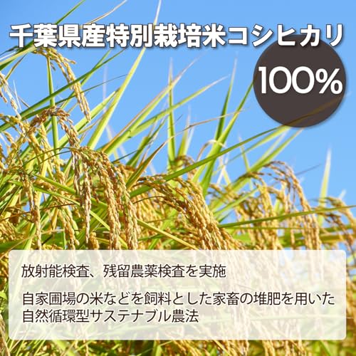 特徴2: 原料には千葉県産のコシヒカリを使用。田植え前に除草剤を一度だけ使用していますが、生育を良くするためや防虫の為に農薬は使っていない、特別栽培米の玄米を使用しています。