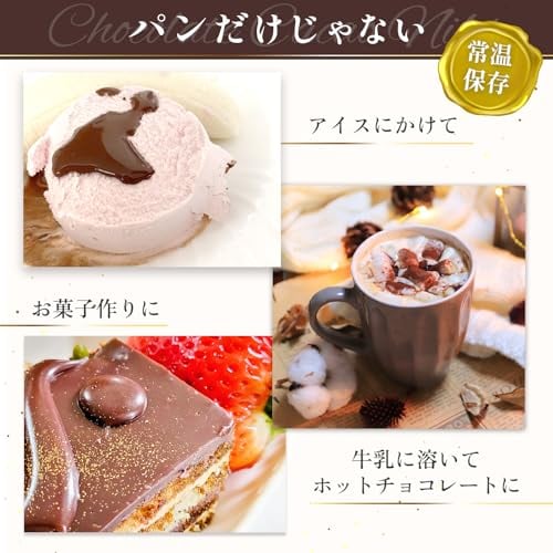 【パン以外にも色々使える!】 お菓子作りやアイスクリームへのトッピング、チョコレートドリンクなどにもお使いいただけるチョコレートスプレッドです。塩味や苦みとの相性が良いので、クラッカーに塗っておつまみにしたり、マーマレードと混ぜたりしてもおいしく召し上がれます。
