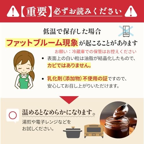 【⚠ご注意⚠】当商品は乳化剤不使用のため、気温により有機ひまわり油とヘーゼルナッツペーストの油分が表面で固まることがあります。これはファットブルーム(油脂の結晶化)現象であり、カビではございませんので安心してお召し上がりください(※)。固まった場合は、湯煎 や 電子レンジ(短時間で少しずつ) で柔らかくしてお召し上がりください。※直射日光や高温多湿を避け、室温で保管してください。開封後はしっかりと蓋をし、お召し上がりの際は清潔なスプーンをお使いください。