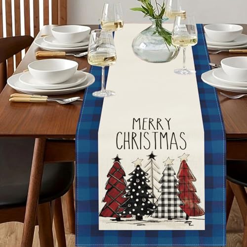 【クリスマステーマの伝統的デザイン】 赤、黒、青、緑のクラシックカラーリングに、クリスマスツリー柄が施され、本格的なクリスマス雰囲気を演出します。両端の格子柄がアメリカンスタイルの風合いを強調し、テーブルを華やかに彩ります。