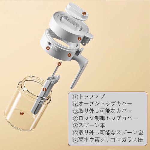 調味料入れ 調味料ポット 調味缶 スパイスボトル 塩 砂糖入れ 粉ふり機能 スプーン内蔵 耐熱ガラス 湿気防止 洗いやすい (はいいろ)