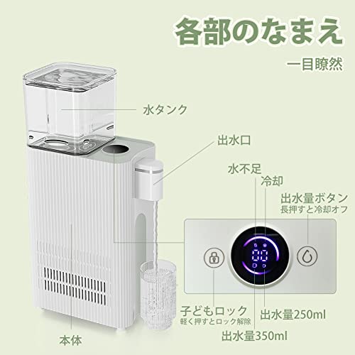 冷水温度 8℃~15℃で氷いらず:ワンタッチで20分冷却したら、レモンやジュース、花果茶、コーヒーが美味しく味わえます。水タンク容量700ml+内部容量500ml、つまり1.2Lです。250ml・350ml出水量も設定できます