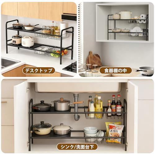 【多シーン·場所に適用】キッチンのシンク下だけでなく、洗面台下、ランドリースペース、浴室、玄関にも適用です。タオル、洗剤、掃除道具、靴、紙箱などをすっきり収納できます。シンプルなデザインとブラック色は、どんなインテリアにも自然に溶け込みます。