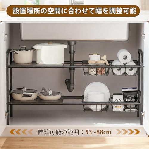 【伸縮式デザイン】こちらのシンク下収納ラックには、伸縮可能で幅を53cmから88cmまで調整できます。スペースやニーズに合わせて柔軟に調整可能となります。又は、付属の棚板とバスケットは取り外しと移動可能なので、排水パイプを避けたり、物を分類したり、大容量の収納ニーズを満足できます。省スペースで収納力をUPします。